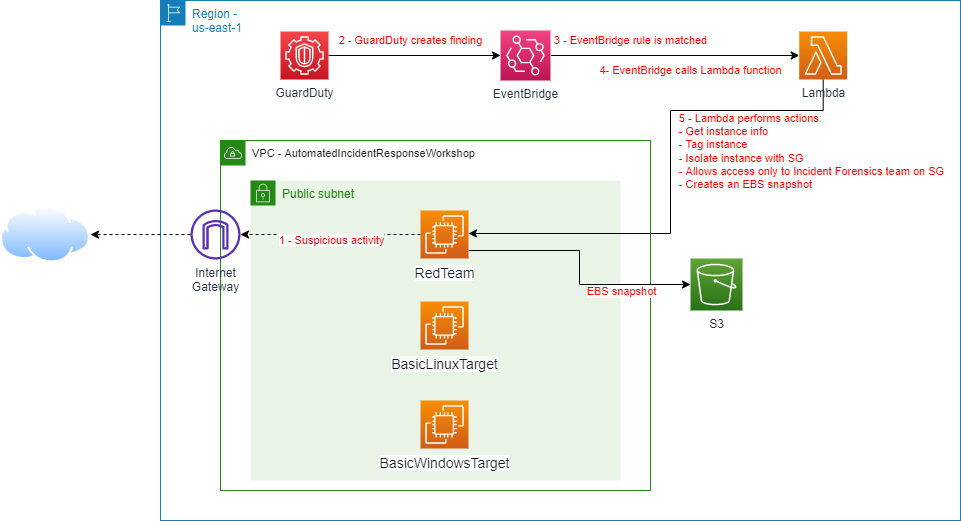 Automated response to Cyberthreats in AWS using the following AWS services: